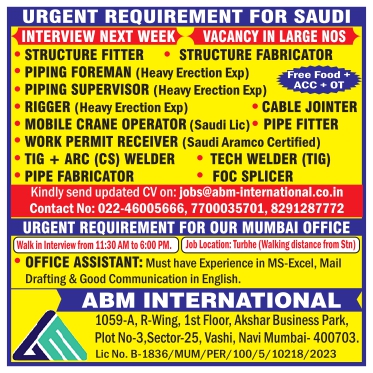 STRUCTURE FITTER STRUCTURE FABRICATOR PIPING FOREMAN (Heavy Erection Exp) PIPING SUPERVISOR (Heavy Erection Exp) Free Food ACC OT RIGGER (Heavy Erection Exp) âš« CABLE JOINTER MOBILE CRANE OPERATOR (Saudi Lic)âš« PIPE FITTER WORK PERMIT RECEIVER (Saudi Ar