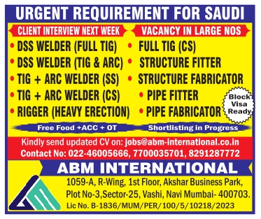 DSS WELDER (FULL TIG) DSS WELDER (TIG & ARC) TIG+ ARC WELDER (SS) TIG+ ARC WELDER (CS) âš« PIPE FITTER RIGGER (HEAVY ERECTION) Free Food +ACC + OT âš« FULL TIG (CS) STRUCTURE FITTER STRUCTURE FABRICATOR PIPE FABRICATOR