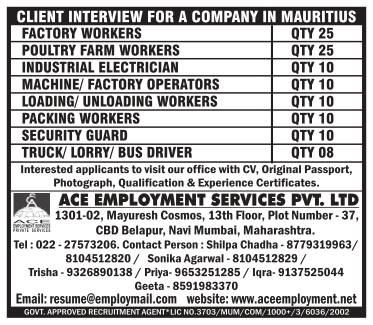 FACTORY WORKERS POULTRY FARM WORKERS INDUSTRIAL ELECTRICIAN MACHINE/FACTORY OPERATORS LOADING/UNLOADING WORKERS PACKING WORKERS SECURITY GUARD TRUCK/ LORRY/ BUS DRIVER