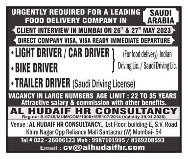 LIGHT DRIVER/CAR DRIVER (For food delivery) Indian Driving Lic./Saudi Driving Lic. •BIKE DRIVER TRAILER DRIVER