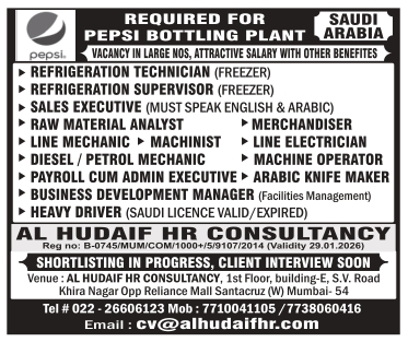 REFRIGERATION TECHNICIAN (FREEZER) â–º REFRIGERATION SUPERVISOR (FREEZER) â–ºSALES EXECUTIVE (MUST SPEAK ENGLISH & ARABIC) â–º RAW MATERIAL ANALYST MERCHANDISER â–ºLINE MECHANIC MACHINIST â–ºLINE ELECTRICIAN â–ºDIESEL / PETROL MECHANIC â–ºMACHINE OPERATOR