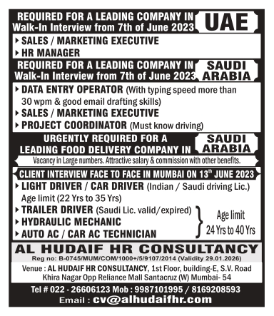 DATA ENTRY OPERATOR SALES/MARKETING EXECUTIVE PROJECT COORDINATOR LIGHT DRIVER/CAR DRIVER TRAILER DRIVER (Saudi Lic. valid/expired) HYDRAULIC MECHANIC AUTO AC/CAR AC TECHNICIAN