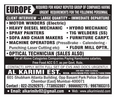 Job Type - MOTOR WINDERS (Electric) HEAVY DIESEL MECHANIC HYDRO MECHANIC SPRAY PAINTERS TIG WELDERS (SS) -SOFA AND CHAIR MAKERS FURNITURE CARPT. MACHINE OPERATORS FLOUR MILL OPTR. -OPTICAL TECHNICIAN