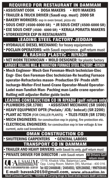 Job Type - ASSISTANT COOK DOSA MAKERS ROTI MAKERS -TRAILER & TRUCK DRIVER (Saudi exp. must) 2000 SR BAKERY WORKERS: exp in oven bread, pizza etc SOUS CHEF (4500-6000 SR) JR SOUS CHEF (4500-6000 SR) EXE SOUS CHEF (4500-6000 SR) KERALA PORATTA MAKERS STOREKEEPER EXP I