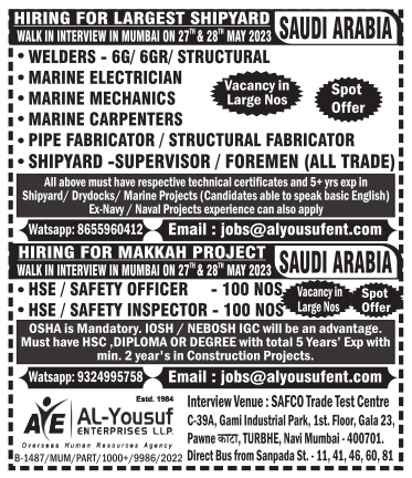 WELDERS-6G/6GR/ STRUCTURAL MARINE ELECTRICIAN 1. MARINE MECHANICS MARINE CARPENTERS PIPE FABRICATOR / STRUCTURAL FABRICATOR SHIPYARD -SUPERVISOR/FOREMEN