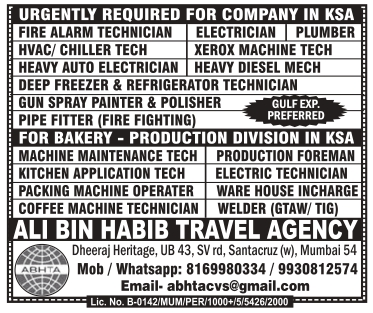 FIRE ALARM TECHNICIAN HVAC/ CHILLER TECH ELECTRICIAN PLUMBER XEROX MACHINE TECH HEAVY AUTO ELECTRICIAN HEAVY DIESEL MECH DEEP FREEZER & REFRIGERATOR TECHNICIAN GUN SPRAY PAINTER & POLISHER PIPE FITTER (FIRE FIGHTING) MACHINE MAINTENANCE TECH KITCHEN APPL