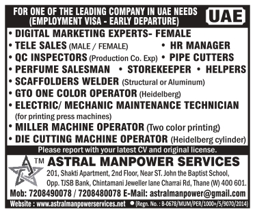 ⚫ DIGITAL MARKETING EXPERTS-FEMALE TELE SALES (MALE/FEMALE) • HR MANAGER QC INSPECTORS (Production Co. Exp)⚫ PIPE CUTTERS PERFUME SALESMAN STOREKEEPER HELPERS • ELECTRIC/ MECHANIC MAINTENANCE TECHNICIAN SCAFFOLDERS WELDER (Structural or Aluminum)