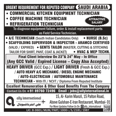 Job Type - A/C TECHNICIAN (South Indian Candidates Only) NURSE (B.Sc) SCAFFOLDING SUPERVISOR & INSPECTOR - ARAMCO CERTIFIED (VALID / EXPIRED) GENTS TAILOR