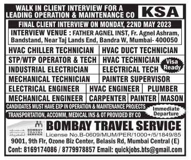 HVAC CHILLER TECHNICIAN STP/WTP OPERATOR & TECH INDUSTRIAL ELECTRICIAN MECHANICAL TECHNICIAN ELECTRICAL ENGINEER MECHANICAL ENGINEER Bandra W, Mumbai-400050 HVAC DUCT TECHNICIAN HVAC TECHNICIAN ELECTRICAL TECH PAINTER SUPERVISOR HVAC ENGINEER PLUMBER CAR