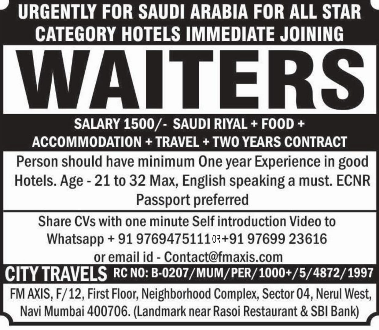 Job Type - Outsourced Company needs Waiters to be deputed at various four star five star Hotels. We need 100 Waiters for Saudi Arabia. The placement will be in all good Hotels. Urgent Requirement and Immediate departure. Candidates with one-year experience in Banque