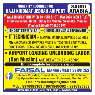 Job Type - IT TECHNICIAN MANAGE, MAINTAIN, REPAIR & DIAGNOSE ANY HARDWARE OR SOFTWARE FAULTS IN IT SYSTEMS & NETWORKS. GOOD ENGLISH COMMUNICATION SKILL. AGE BELOW 35 YRS. AIRPORT LOADING UNLOADING LABOR
