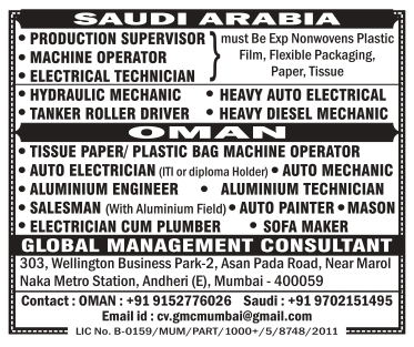 Job Type - TISSUE PAPER/ PLASTIC BAG MACHINE OPERATOR AUTO ELECTRICIAN (ITI or diploma Holder)⚫ AUTO MECHANIC ALUMINIUM ENGINEER • ALUMINIUM TECHNICIAN SALESMAN (With Aluminium Field ) AUTO PAINTER MASON ELECTRICIAN CUM PLUMBER • SOFA MAKER