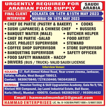 Job Type - CHEF DE PARTIE (PASTRY & BAKERY) • COOKS SUSHI (JAPANESE) & CHINESE CHEF⚫ BUSSERS • BANQUET WAITER (MALE) • BUTCHER HELPER CHEF DE PARTIE -SALAD • FOOD ARTIST • ASST. PROJECT SUPERVISOR ⚫ STEWARD • COFFEE SHOP SUPERVISOR • STORE SUPERVIS