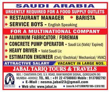 RESTAURANT MANAGER BARISTA SERVICE BOYS ALUMINUM FABRICATOR / FOREMAN CONCRETE PUMP OPERATOR - Saudi Lic (Valid/ Expired) HEAVY DRIVER - Valid Saudi Lic ESTIMATION ENGINEER
