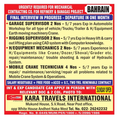 Job Type - GARAGE SUPERVISOR RIGGING SUPERVISOR H/EQUIPMENT MECHANICS MOBILE CRANE TECHNICIAN