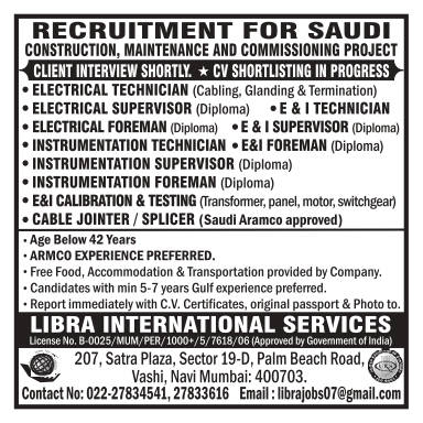 ELECTRICAL TECHNICIAN (Cabling, Glanding & Termination) ⚫ ELECTRICAL SUPERVISOR (Diploma ) ⚫E & I TECHNICIAN ELECTRICAL FOREMAN (Diploma) E&I SUPERVISOR (Diploma ) INSTRUMENTATION TECHNICIAN E&I FOREMAN (Diploma) INSTRUMENTATION SUPERVISOR (Diploma) I