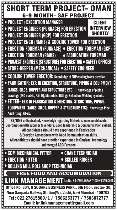 PROJECT/EXECUTION MANAGER PROJECT ENGINEER (FURNACE) FOR ERECTION PROJECT ENGINEER (GCP) FOR ERECTION PROJECT ENGR (RMHS) & COOLING TOWER FOR ERECTION ERECTION FOREMAN (FURNACE ) ERECTION FOREMAN (GCP) FABRICATION FOREMAN ERECTION FOREMAN (RMHS) PROJECT