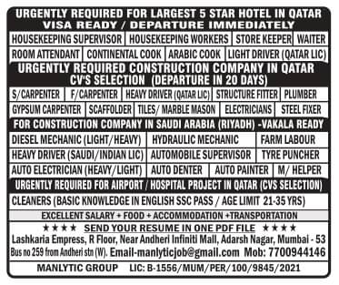 HOUSEKEEPING SUPERVISOR HOUSEKEEPING WORKERS STORE KEEPER WAITER ROOM ATTENDANT CONTINENTAL COOK ARABIC COOK LIGHT DRIVER S/CARPENTER F/CARPENTER HEAVY DRIVER (QATAR LIC) STRUCTURE FITTER PLUMBER GYPSUM CARPENTER SCAFFOLDER TILES/ MARBLE MASON ELECTRICIA