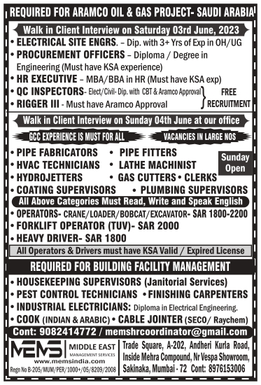ELECTRICAL SITE ENGRS PROCUREMENT OFFICERS HR EXECUTIVE QC INSPECTORS RIGGER PIPE FABRICATORS PIPE FITTERS HVAC TECHNICIANS LATHEMACHINIST SUPERVISORS HYDROJETTERS • GAS CUTTERS CLERKS COATING SUPERVISORS PLUMBING OPERATORS-CRANE/LOADER/BOBCAT/EXCAVAT