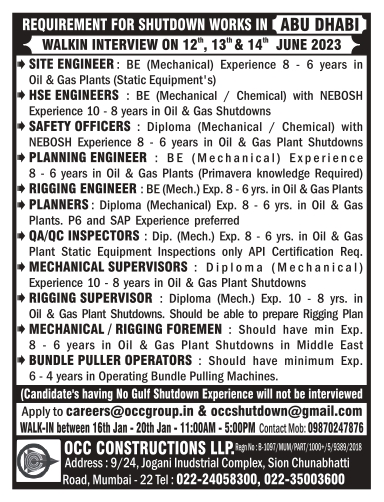 SITE ENGINEER HSE ENGINEERS SAFETY OFFICERS PLANNING ENGINEER RIGGING ENGINEER PLANNERS QA/QC INSPECTORS MECHANICAL SUPERVISOR RIGGING SUPERVISOR MECHANICAL/RIGGING FOREMEN BUNDLE PULLER OPERATORS