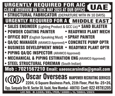 SALES ENGINEER (Lighting Product & GCC Lic)⚫ SAND BLASTER • READYMIX PLANT MECH POWDER COATING PAINTER OFFICE BOY (English Speaking Must) SPRAY PAINTER QA/QC MANAGER (ARAMCO Approved) CONCRETE PUMP OPTR BUSINESS DEVELOPMENT MNGR READYMIX PLANT OPTR PI