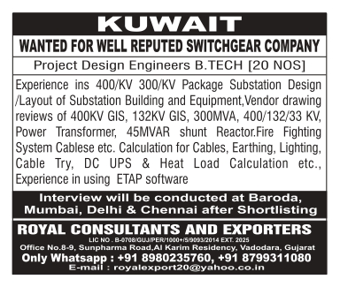 Job Type - Experience ins 400/KV 300/KV Package Substation Design /Layout of Substation Building and Equipment, Vendor drawing reviews of 400KV GIS, 132KV GIS, 300MVA, 400/132/33 KV, Power Transformer, 45MVAR shunt Reactor.Fire Fighting System Cablese etc. Calculati