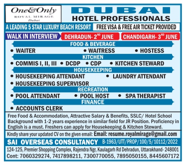 FOOD & BEVERAGE CHANDIGARH-3 JUNE • WAITER • WAITRESS • HOSTESS KITCHEN COMMIS I, II, III ⚫ DCDP • CDP • KITCHEN STEWARD HOUSEKEEPING HOUSEKEEPING ATTENDANT LAUNDRY ATTENDANT • HOUSEKEEPING SUPERVISOR RECREATION POOL ATTENDANT POOL HOST SPA