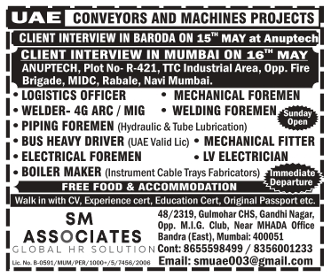 LOGISTICS OFFICER MECHANICAL FOREMEN WELDER-4G ARC/MIG WELDING FOREMEN Sunday Open PIPING FOREMEN (Hydraulic & Tube Lubrication) BUS HEAVY DRIVER (UAE Valid Lic) MECHANICAL FITTER I-ELECTRICAL FOREMEN .LV ELECTRICIAN BOILER MAKER