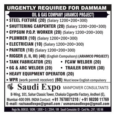 STEEL FIXTURE (20) (Salary 1200+200+300) SHUTTERING CARPENTER (20) (Salary 1200+200+300 ) GYPSUM P.O.P. WORKER (20) (Salary 1200+200+300 PLUMBER (10) (Salary 1200+200+300) ELECTRICIAN (10) (Salary 1200+200+300) ) PAINTER (10) (Salary 1200+200+300) RIGGER