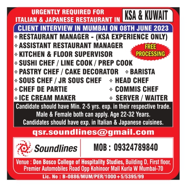 Job Type - RESTAURANT MANAGER - (KSA EXPERIENCE ASSISTANT RESTAURANT MANAGER KITCHEN & FLOOR SUPERVISOR SUSHI CHEF/LINE COOK/PREP COOK ONLY) FREE PROCESSING PASTRY CHEF / CAKE DECORATOR > BARISTA SOUS CHEF/JR SOUS CHEF HEAD CHEF CHEF DE PARTIE + COMMIS CHEF ICE CREA