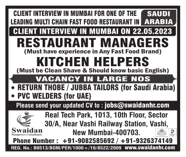 Job Type - RESTAURANT MANAGERS (Must have experience in Any Fast Food Brand) KITCHEN HELPERS