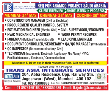 Job Type - CONSTRUCTION MANAGER (Civil or Electrical) PROCUREMENT QUALITY CONTROL SYSTEM ESTIMATION ENGINEER (Mech/ Civil) CIVIL SUPERVISOR/ENGINEER HVAC MECHANICAL ENGINEER FOREMAN (Building Trade/Multicraft) • WORK PERMIT RECEIVER LEAD CIVIL ENGINEER DOCUMENT CO