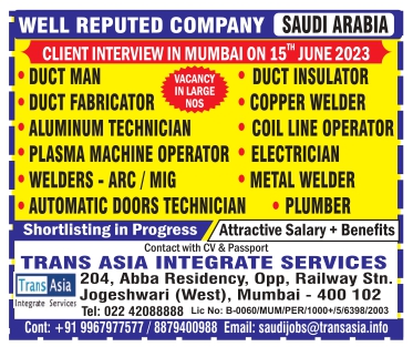 Job Type - ⚫DUCT MAN VACANCY IN LARGE NOS • DUCT INSULATOR |⚫DUCT FABRICATOR ALUMINUM TECHNICIAN PLASMA MACHINE OPERATOR |⚫WELDERS - ARC/MIG • COPPER WELDER • COIL LINE OPERATOR ELECTRICIAN • METAL WELDER AUTOMATIC DOORS TECHNICIAN PLUMBER