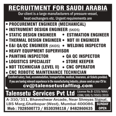 PROCUREMENT ENGINEER (MECHANICAL) INSTRUMENT DESIGN ENGINEER (SKIDS) STATIC DESIGN ENGINEER • ESTIMATION ENGINEER THERMAL DESIGN ENGINEER NDT III ENGINEER E&I QA/QC ENGINEER (SKIDS) WELDING INSPECTOR HEAVY EQUIPMENT SUPERVISOR PAINTING INSPECTOR QA QC I