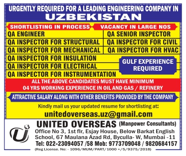 Job Type - QA ENGINEER QA SENIOR INSPECTOR QA INSPECTOR FOR STRUCTURAL QA INSPECTOR FOR CIVIL QA INSPECTOR FOR MECHANICAL QA INSPECTOR FOR HVAC QA INSPECTOR