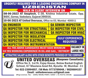 Job Type - QA ENGINEER QA INSPECTOR FOR STRUCTURAL QA INSPECTOR FOR MECHANICAL QA INSPECTOR FOR INSULATION QA INSPECTOR FOR ELECTRICAL QA INSPECTOR FOR INSTRUMENTATION QA SENIOR INSPECTOR QA INSPECTOR FOR CIVIL QA INSPECTOR FOR HVAC