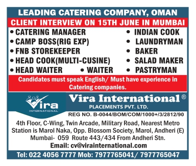 CATERING MANAGER CAMP BOSS(RIG EXP) FNB STOREKEEPER INDIAN COOK • LAUNDRYMAN • BAKER HEAD COOK(MULTI-CUSINE) • SALAD MAKER • HEAD WAITER • WAITER • PASTRYMAN