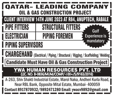 PIPE FITTERS STRUCTURAL FITTERS | ELECTRICIAN PIPING FOREMEN PIPING SUPERVISORS CHARGEHAND