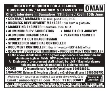 Job Type - •CONTRACT MANAGER: BE Civil, plus FIDIC, RICS BUSINESS DEVELOPMENT MANAGER : for Alum & glass div MARKETING ENGINEER : Structural steel MBA ALUMINUM SUPV FABRICATION ⚫ BDM FIT OUT JOINERY • PLANNING ENGINEER ALUMUIUM DRAUGHTSMAN JOINERY FIT OUT DRAU