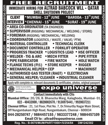 AREA CO-ORDINATOR (TA ENGINEER) FOREMAN (RIGGING/ MECHANICAL/ WELDING) COORDINATOR (LOGISTICS/WASTE / VALVE/PTW) • MATERIAL CONTROLLER • TECHNICAL CLERK DOCUMENT CONTROLLER FORKLIFT OPERATOR PROGRESS TRACKER LOGISTICS LEAD HSE OFFICER WELDER-TIG & ARC